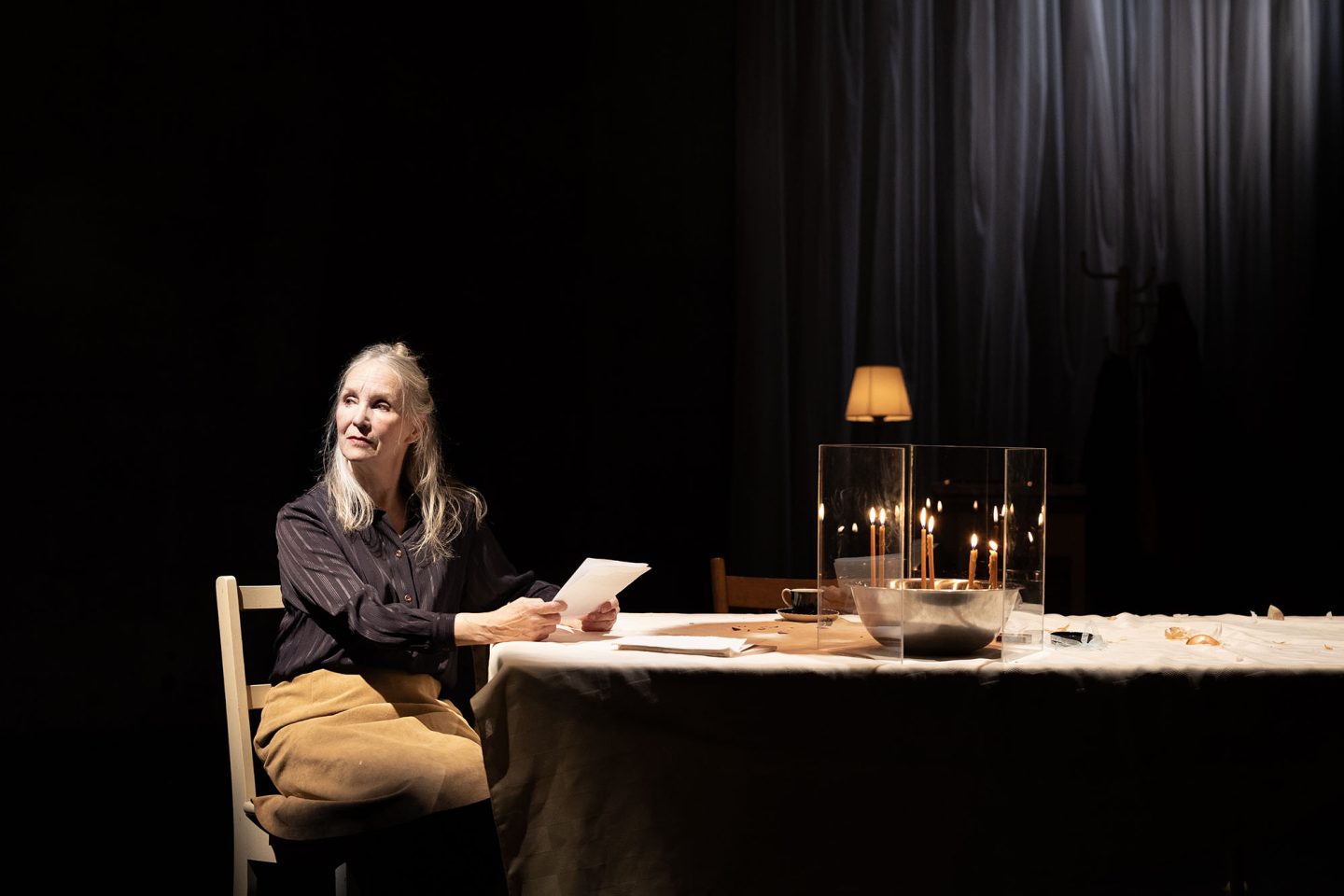 Le public est d’abord et avant tout plongé dans le noir. L’obscurité ne se dissipe pas immédiatement. Au contraire, elle s’affirme et s’approfondit. On entend alors une voix alors qu’un objet dans l’espace de jeu est éclairé par une lumière douce, tamisée. Un silence. Une autre voix enchaîne avec un autre objet. Et ainsi de suite. Tour à tour, alors que l’on passe d’une radio à un téléphone, à un grille-pain ou à un cadre de photo vide, et les voix bâtissent un discours sur l’absence, le manque de l’autre, le départ, l’isolement – le deuil.
