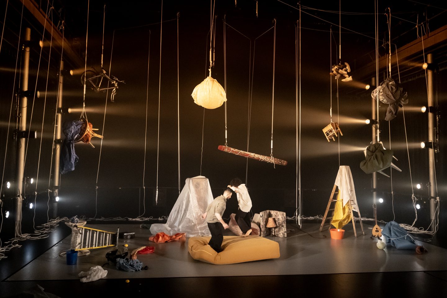 La performance se poursuit avec Tawfik et Moumneh qui forment des sculptures abstraites avec des objets du quotidien (tapis, meubles, escabeaux, toiles de plastique, évier, bicyclette…). Le duo se servira ensuite de cordes pour attacher certains artéfacts, à plusieurs moments en cours de (re)présentation, et les soulever par un système de poulies. Suspendus en l’air dans l’espace vide de la salle, les objets rappellent la vraie vie, tout en situant le plateau entre les mondes, entre mythes et réalités.