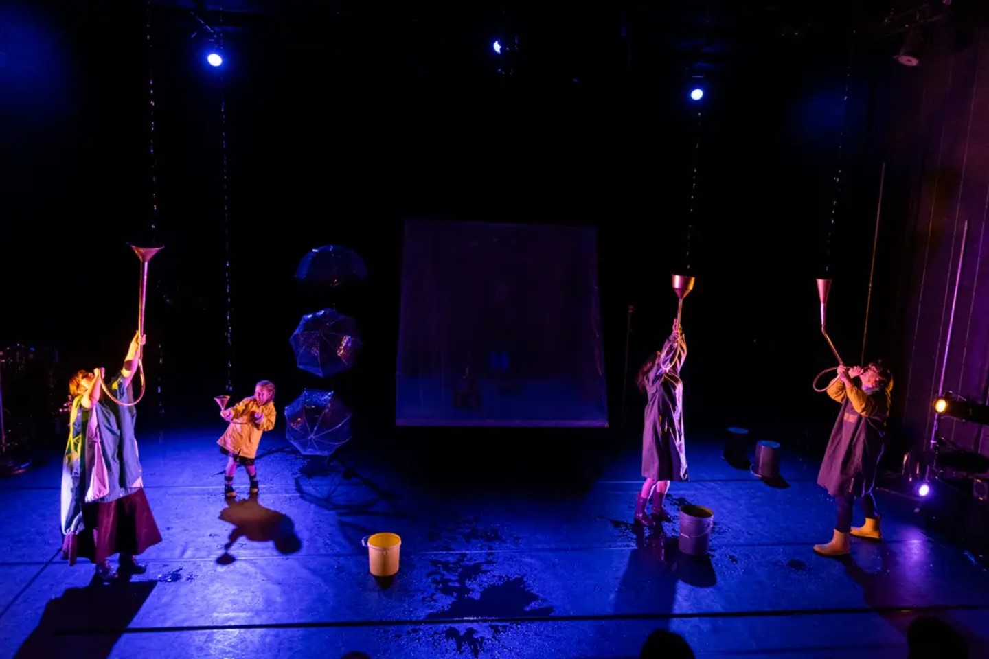 Thomas Sinou en est le maître d’œuvre sonore, orchestrant une symphonie bricolée à partir d’instruments inventés — entonnoirs, capteurs de pluie, objets détournés — et d’autres plus familiers, comme la guitare. Sa partition, tour à tour onirique, punk et méditative, rappelle l’univers visuel de Wes Anderson : un théâtre de l’intime où règnent la fantaisie, la tendresse et une douce folie. Des gouttelettes de pluie tombent du plafond du théâtre, mais pas de panique : c’est justement le but du jeu!