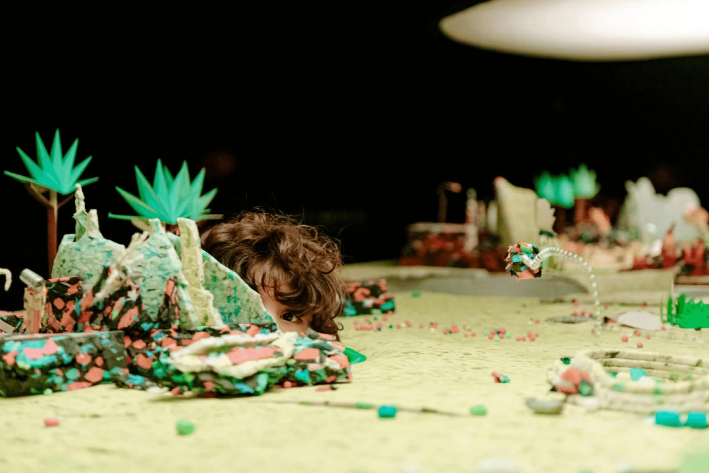 Certaines personnes y voient une grève, d’autres un jardin, quelques-unes encore une terre inconnue. Mais toutes restent coites devant les confettis, paillettes, petits moteurs et autres matériaux qui donnent vie aux insectes, aux fleurs, aux vers et au aléas météorologiques. Après quelques minutes, on en oublie les bricolages et on se laisse emporter par cette proposition inédite : vivre au cœur d’un écosystème pour en ressentir ses rythmes, ses équilibres et ses variations.