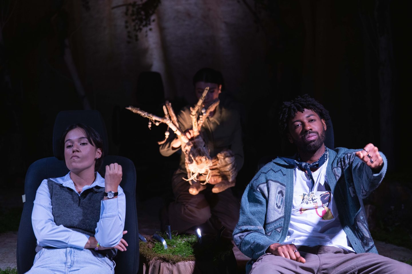 Le dispositif joue à la fois de réalisme et d’une symbolique liée au conte, à l’enfance : on y retrouve aussi bien des sièges et banquettes de voiture ou une glacière que des arbres, de la végétation, des souches autour d’une clairière centrale, fermée par une toile qui recevra des jeux d’ombres, notamment celle d’une marionnette-animal étrange constituée d’une tête à panache et d’un arrière-train qui évoque celui d’un lapin, un Jackalope.