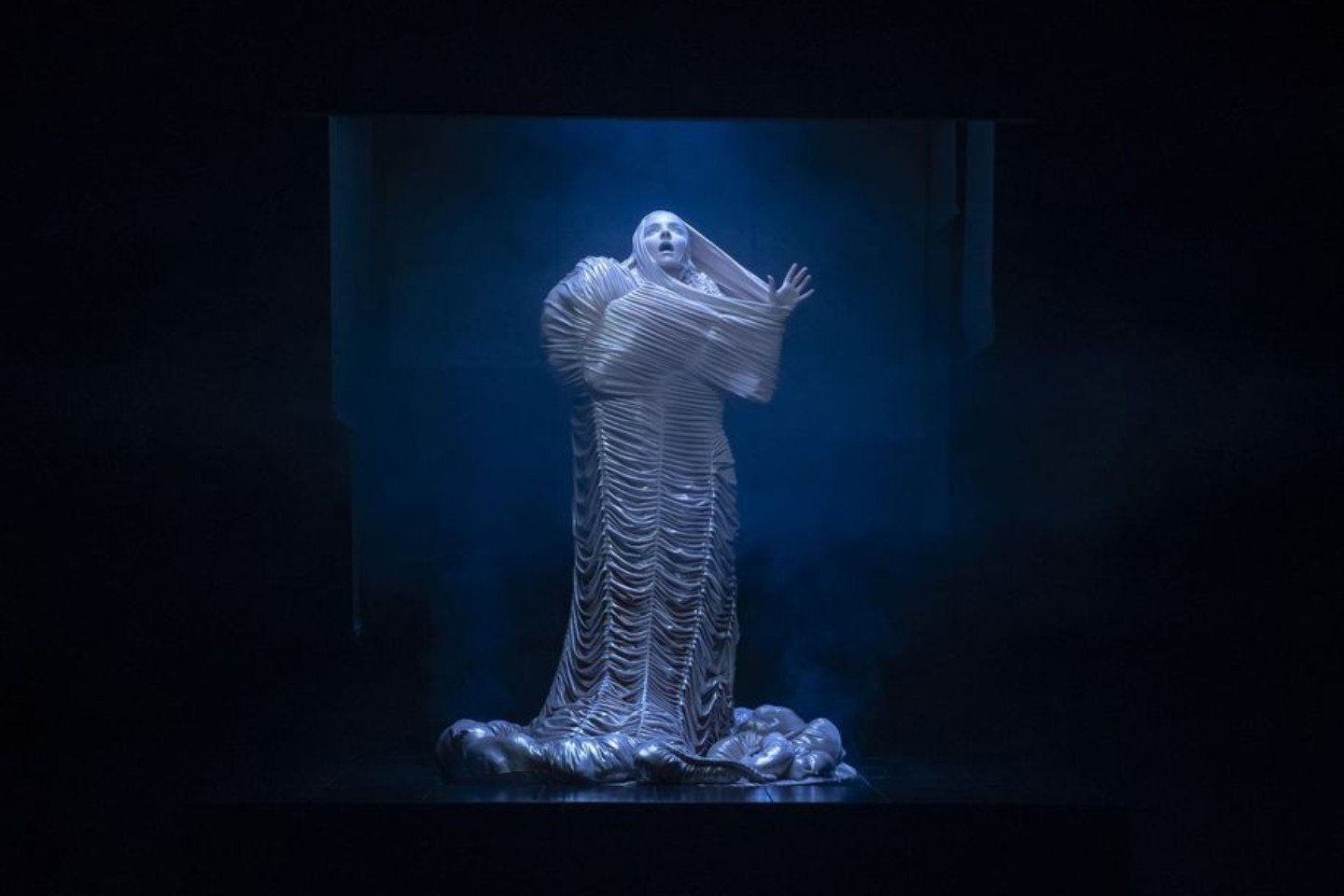 Cédric Delorme-Bouchard, fidèle à sa démarche d’écritures scéniques atypiques, articule ici un langage total où la lumière, les écrans et le son ne forment qu’un seul organisme scénographique. Les images, les textures lumineuses, les costumes — tout est étrange, cru, froid — participent à cette sensation d’immersion irréelle qui peut justement conduire à une certaine déréalisation. Un couloir de chair et de fumée. La présence d’une musique et de sonorités glaciales et abrasives ancre l’ensemble dans une atmosphère qui relève du fantastique, de ce qui est clinique.