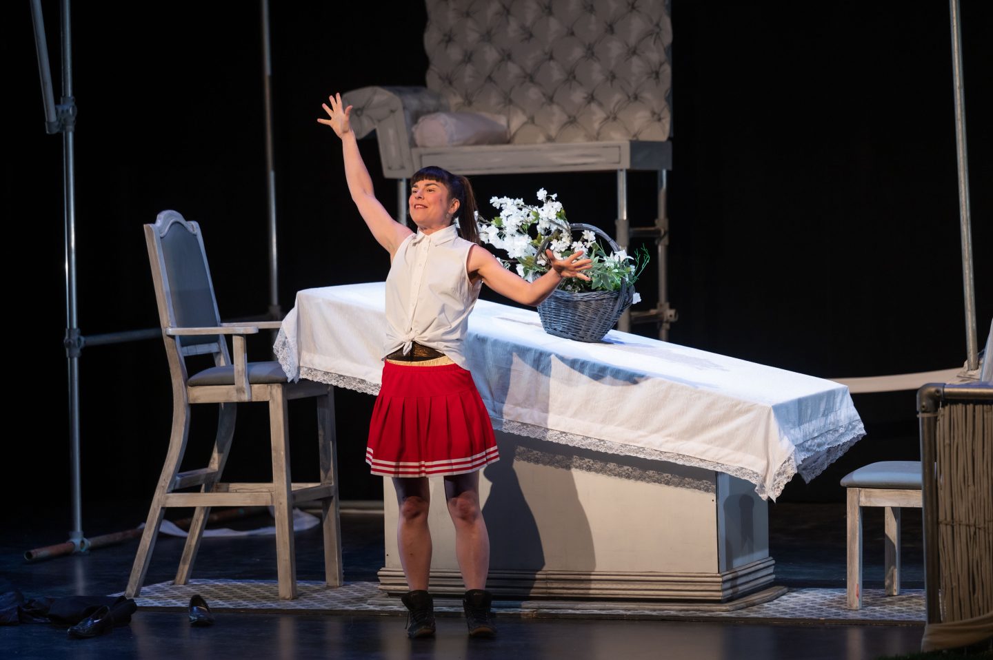Dans le décor, tout est croche, table et lit à angle prononcé, chaises trop courtes ou trop basses. Peut-être parce qu’un foyer en ordre et éternellement heureux, ça n’existe pas. Ces structures polyvalentes permettent à la comédienne d’effectuer plusieurs acrobaties, celles que nous pratiquons aussi, ne serait-ce qu’en pensée, au sein du couple. Et on rencontre quelqu’un∙e d’autre et le cœur fait boum boum de nouveau. Et quand le cœur finit par éclater, que fait-on après ?